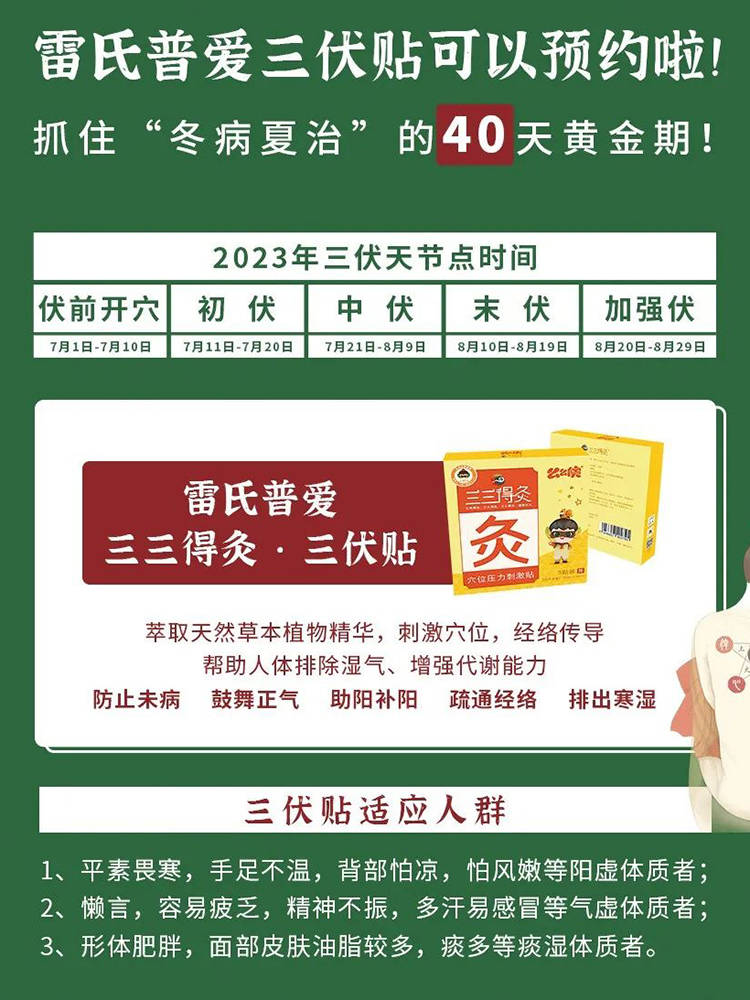快来加入我们的三伏天熏蒸行列吧!让我们一起拥有一个清爽舒适的夏天!除此之外,还可搭配使用雷氏普爱的三三得灸·三伏贴哦,附上今年的三伏天节点时间: