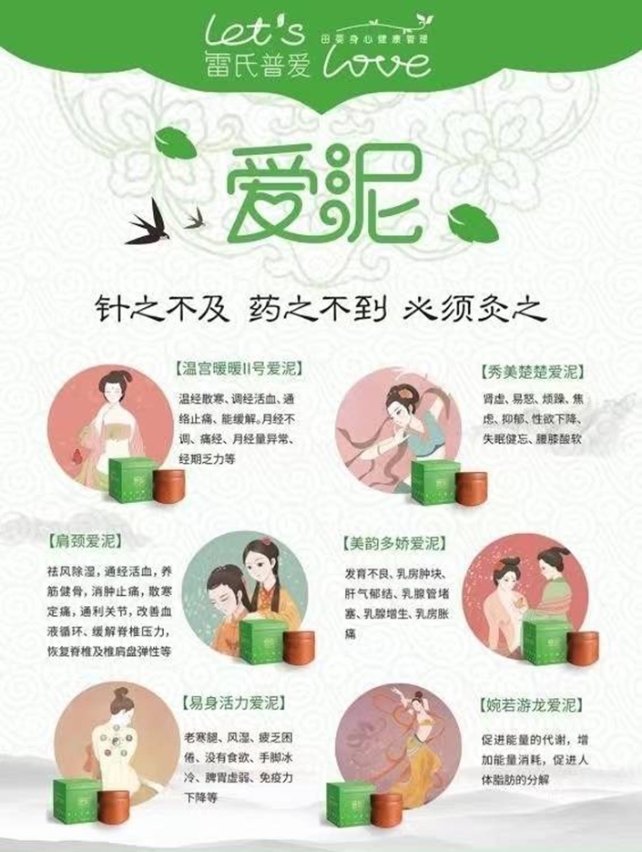 雷氏普爱根据古人的经验,研发出了六款可以通经活络、养血止痛、祛寒除湿的草本产品——爱泥,超微萃取多种草本植物精华,通过加热敷在肩颈或腰腹后就可以持续释放温热能量,并通过穴位渗透到人体内部,帮助预防月子病,缓解各种痛症和身体不适。