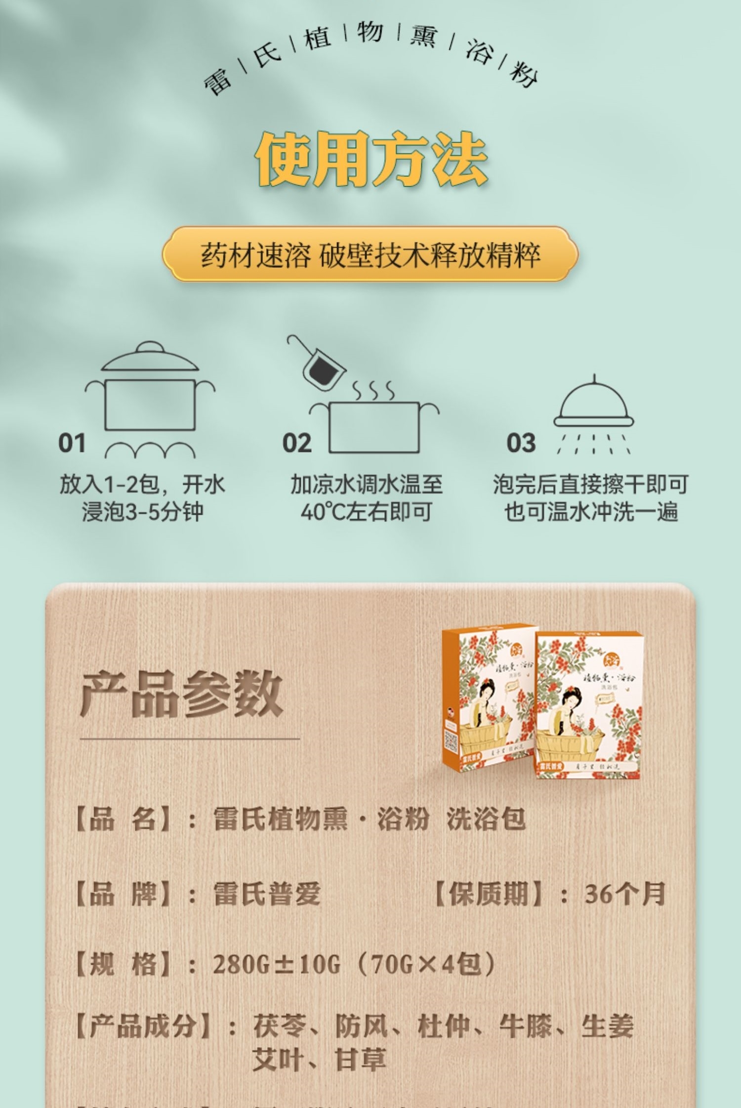 雷氏普爱在这里给大家推荐自家的植物熏·浴粉洗浴包,含有杜仲、生姜、防风、甘草、牛膝、茯苓、艾叶等多种天然植物成分,自有9700亩原生态种植基地,从源头保证产品质量。汉方草本配比,科学萃取技术。帮助你赶走产后问题,迎接美丽身材,保持舒适睡眠。