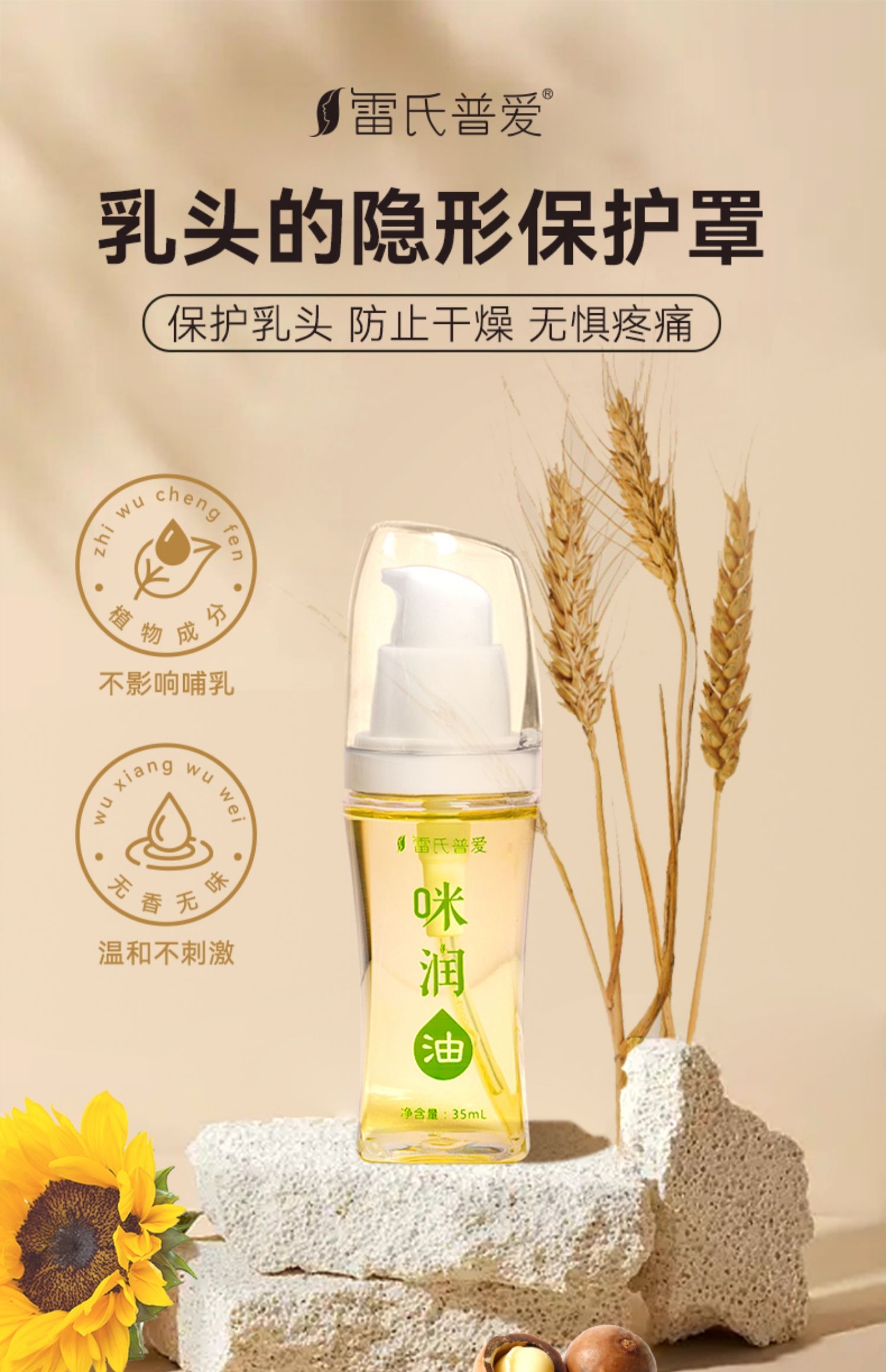 首先,遇到这类问题的女粉丝不用过于担心,雷氏普爱作为发展了27年的产康大品牌,早就为大家研发出来了一款超级好用的产品:咪润油,它含有多种天然油成分,如蛋黄油、葵花籽油、澳洲坚果籽油、小麦胚芽油等,可以帮助我们保护乳头、防止干燥,很多朋友抹上两天后就有效果了。