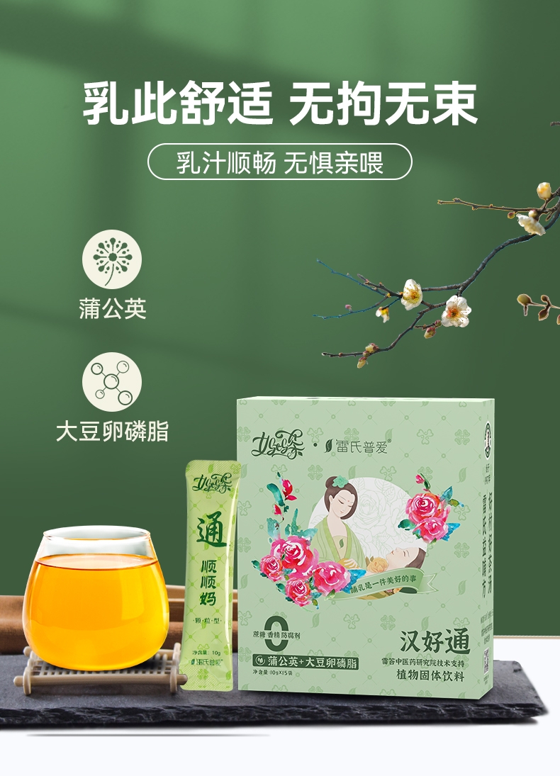 比如有的产后缺乳是肝气郁了,乳头不通,后面的乳汁出不来,所以乳房发胀发疼,有硬块。这时盲目地补,只会越补越胀,严重的话,还会得乳腺炎。雷氏普爱自有的雷答中医药研究院研制的妈妈茶汉好通,里面含有蒲公英、菊花、淡竹叶、桑叶、大豆暖磷脂等疏肝理气的食材成分,可以很好的帮助我们消肿散结,疏通乳腺。