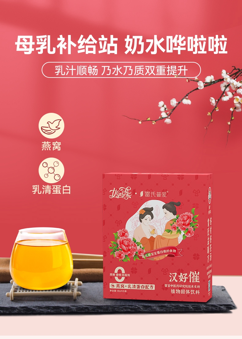 比如,针对气血亏虚型的产后缺乳,我们雷氏普爱自有的59余位国医大师和专家团队们研发了一款药食同源的妈妈茶汉好养,它里面含有木瓜、葛根、枸杞子、龙眼肉等益气养血的食材成分,经常饮用,能起到补气血、催乳、美容的三重作用。