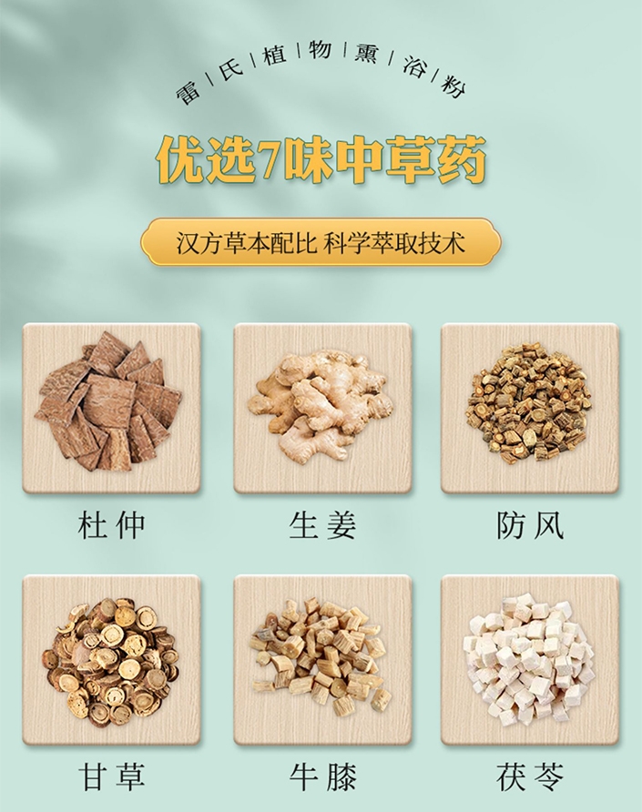 这款熏浴粉是由优选的7味中草药和汉方草本配比而成,来自雷氏普爱自有9700亩中草药基地,采用科学萃取技术,能够有效改善身体湿气,让我们做轻盈的自己。