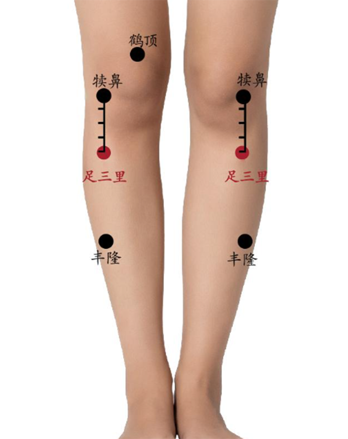 ③足三里取穴法:外膝眼下的约3寸(同上),胫骨前缘旁开1横指(拇指宽度)。