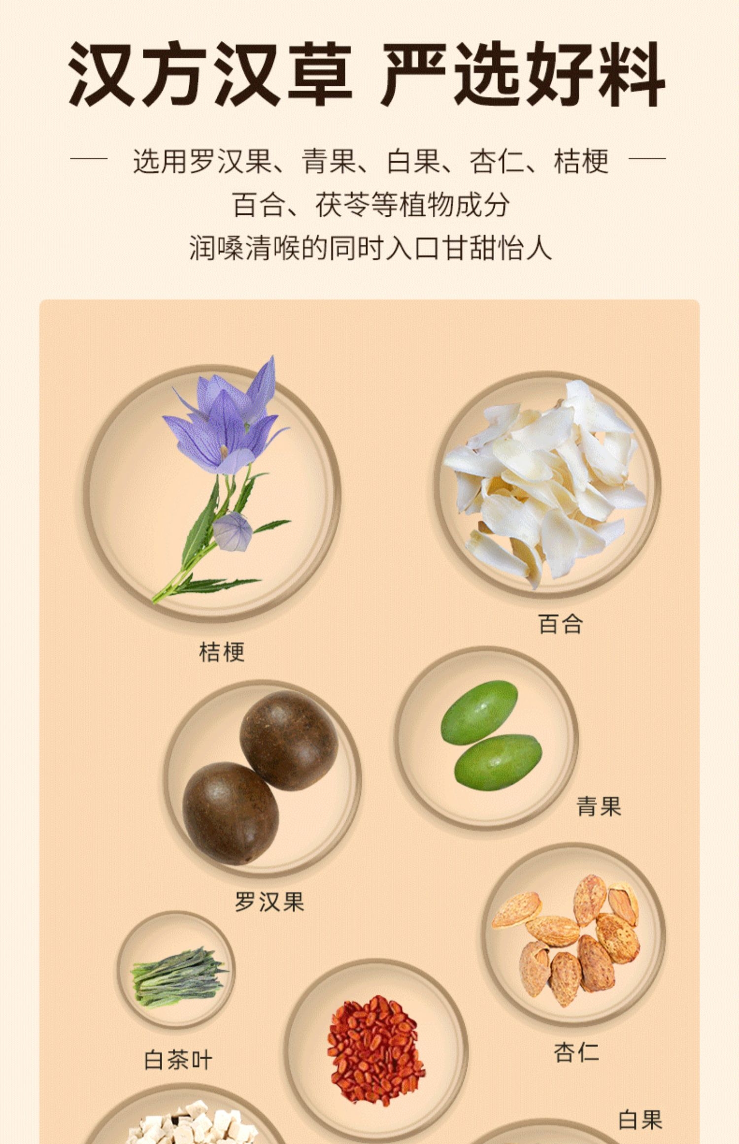 食材:罗汉果、青果、白果、杏仁、桔梗、百合、茯苓、桔红、白茶叶。